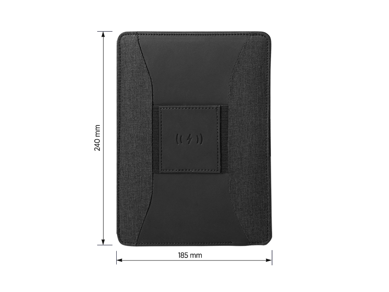 Бележник А5 в папка, с вградена батерия 4000 mAh (output 5V / 2.1A) и USB кабел, безжично зарядно 5W, стойка за телефон, джобове и държач за химикалка. Текстилни корици. Страници на редове; цвят на хартията - слонова кост. Размери на бележника: 18.5 x 24 x 3 см. Подаръчна кутия.