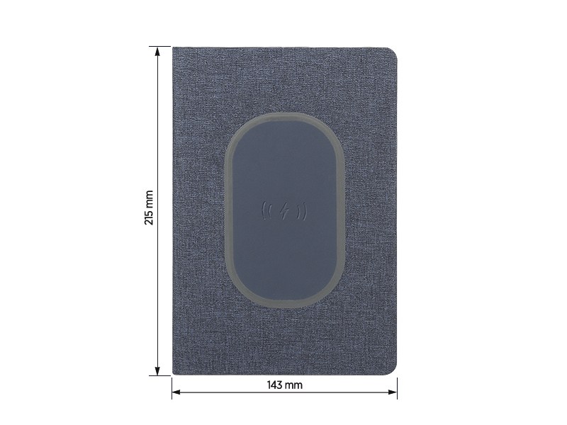 Бележник А5 с вградено безжично зарядно 5W. Текстилни корици. Страници на редове; цвят на хартията - слонова кост. Размери на бележника: 14.3 x 21.5 x 1.4 см.