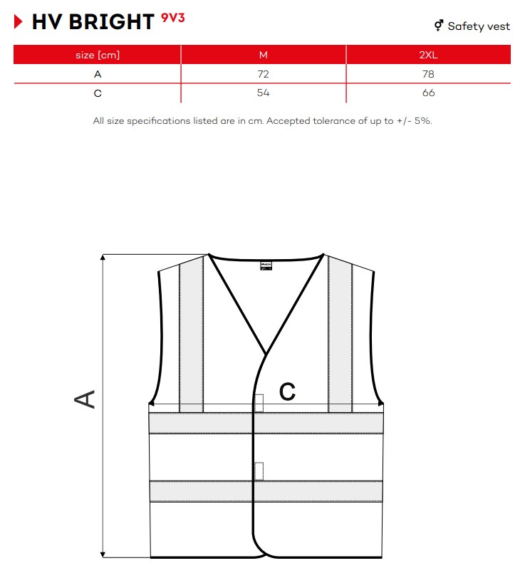 Сигнален елек със светлоотразителни ленти. Закопчеване с велкро. Отговаря на стандарти EN ISO 20 471 (class 2) и EN ISO 13 688.