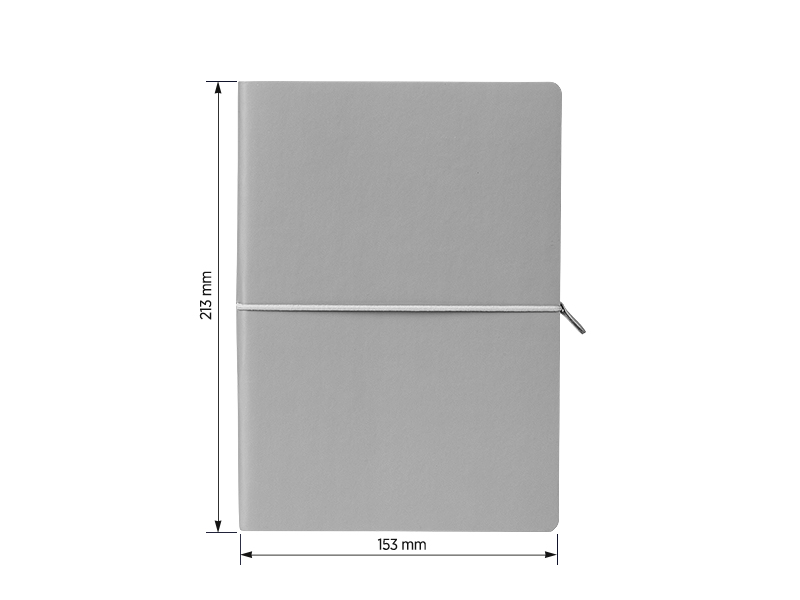 Бележник във формат А5 с гъвкава корица, заоблени ръбове и ластик. Размери: 15.3 x 21.3 см. Страници на редове, хартия цвят слонова кост.