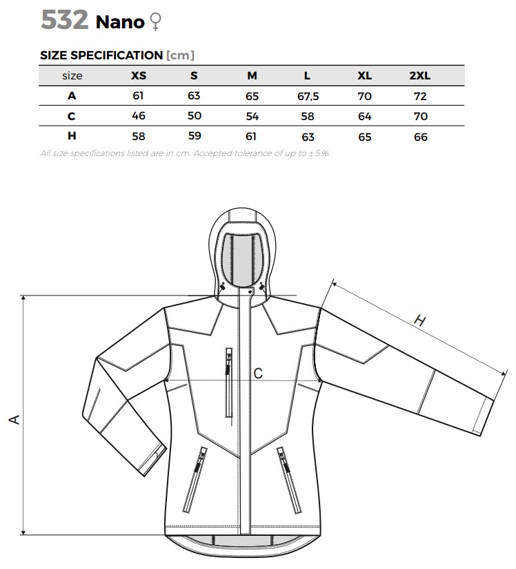 Дамско яке от трислоен softshell. Водоустойчива 5 000 mm и дишаща 600 g/m²/24 h материя. Два предни джоба и един на гърдите.