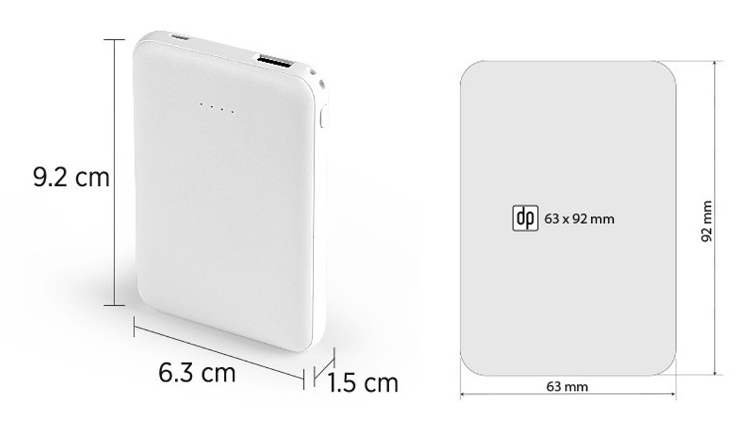 Външна батерия с капацитет 3000 mAh (output USB, input micro USB) в подаръчна кутия. Размери на продукта: 9.2 x 6.3 x 1.5 см.